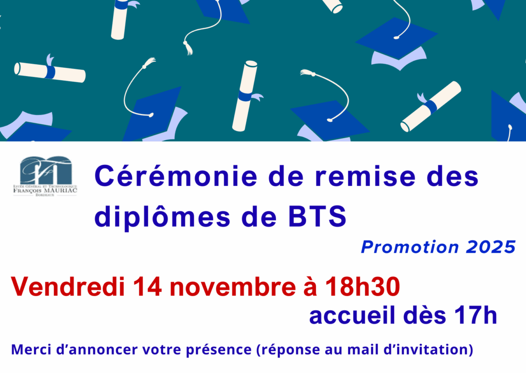 Le vendredi 14 novembre à 18h30 (accueil dès 17h) aura lieu la remise des diplômes du baccalauréat et de BTS.