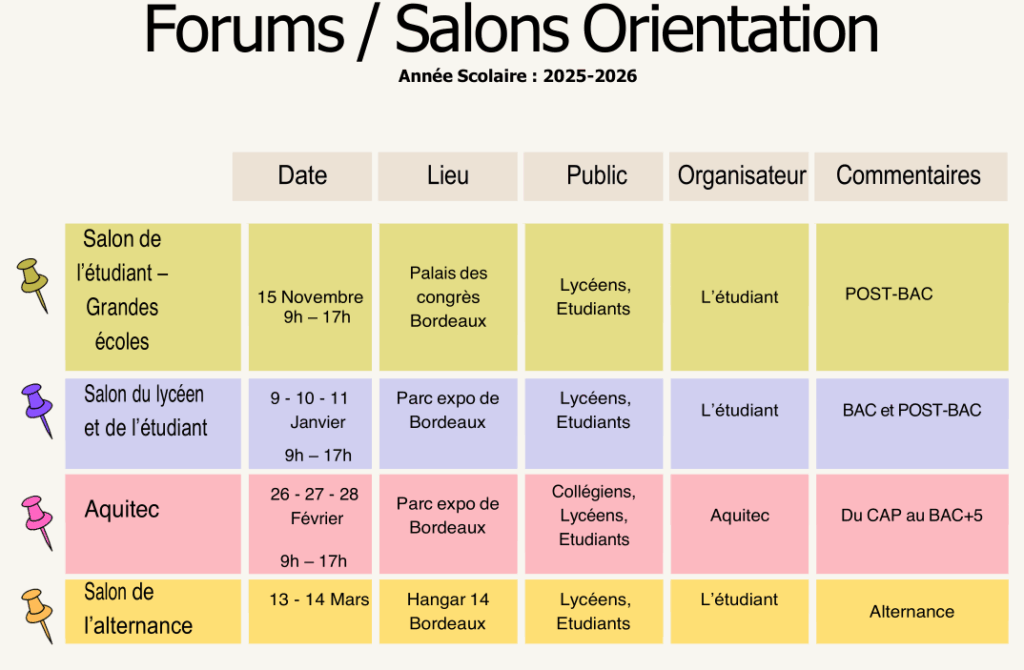 Vous retrouverez dans l’image ci-dessus un calendrier des différents forums à venir pour construire votre orientation.