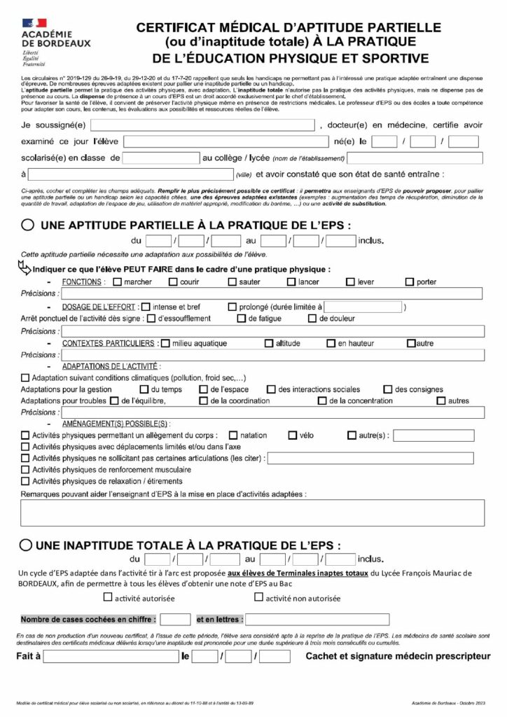 Certificat médical – Dispense d’EPS