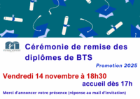 Le vendredi 14 novembre à 18h30 (accueil dès 17h) aura lieu la remise des diplômes du baccalauréat et de BTS. Merci de confirmer votre présence en répondant au mail d’invitation.